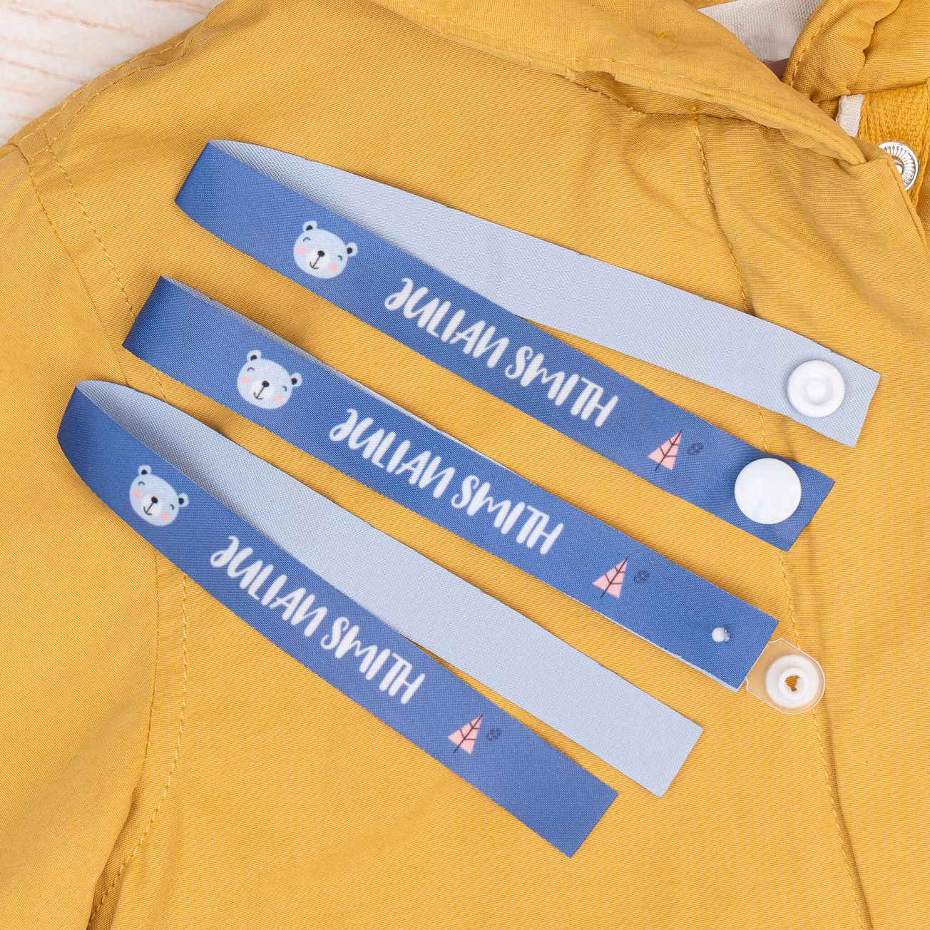 Nuestras cintas se pueden personalizar por una cara con cualquier texto que elijas. Ya sea el nombre de tu hijo, tu número de teléfono, una dirección de correo electrónico, o cualquier otro dato relevante, puedes asegurarte de que la prenda de ropa estará siempre identificada. Además, puedes añadir iconos, emojis y diseños para hacer cada cinta única y divertida.
