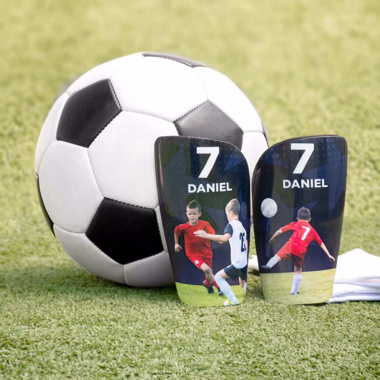 Las espinilleras con foto son un detalle motivador para los más pequeños. Pueden personalizarlas con su nombre, dorsal o escudo del equipo, combinando seguridad y diversión en el juego.