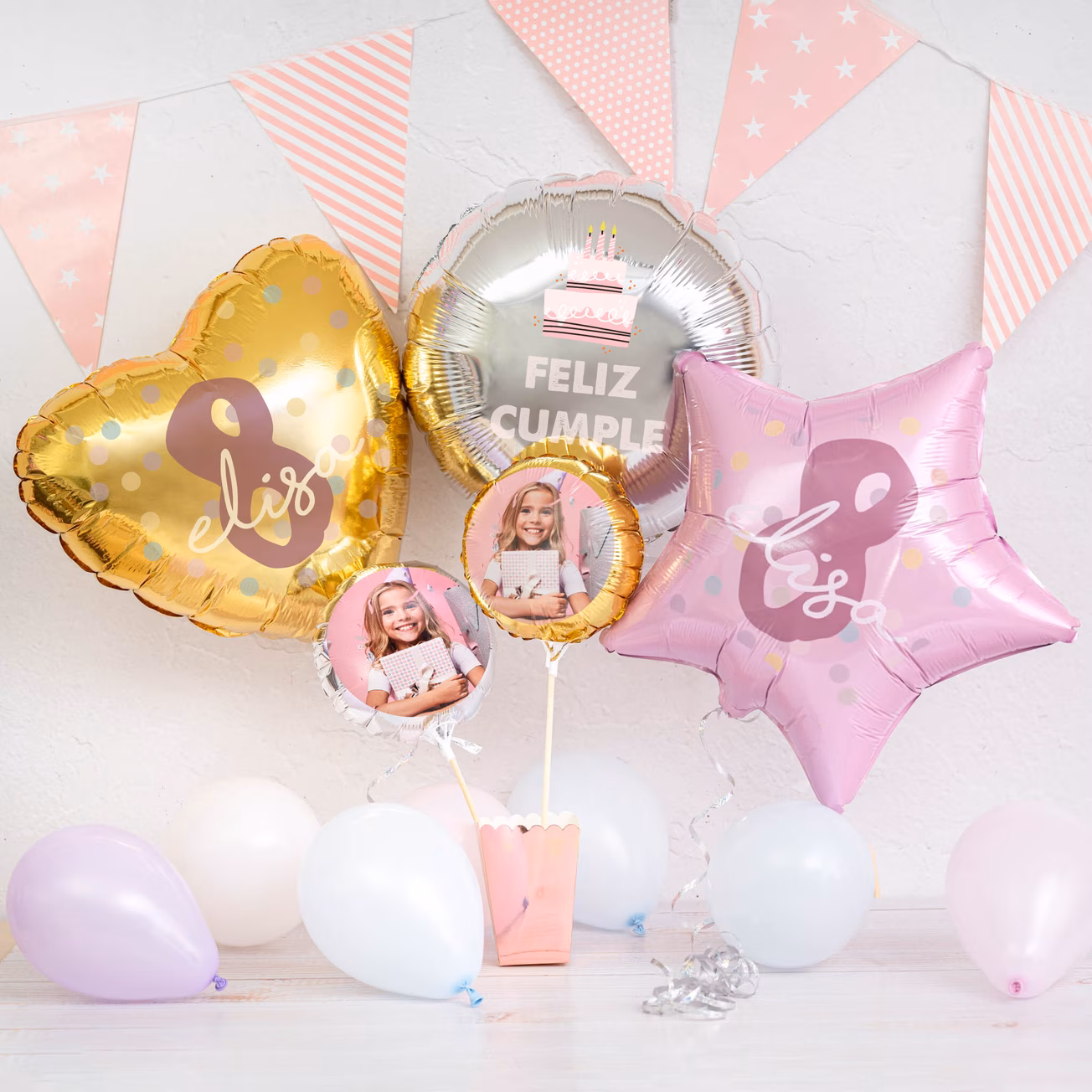 Lo destacado de nuestros globos personalizados es la posibilidad de personalizarlos con cualquier foto, imagen, nombre, número, logotipo o diseño que desees. ¿Quieres sorprender a tus invitados con una decoración única y memorable? Nuestros globos te ofrecen la oportunidad de plasmar tu mejor foto o mensajes especiales, convirtiendo tus eventos en experiencias inolvidables.