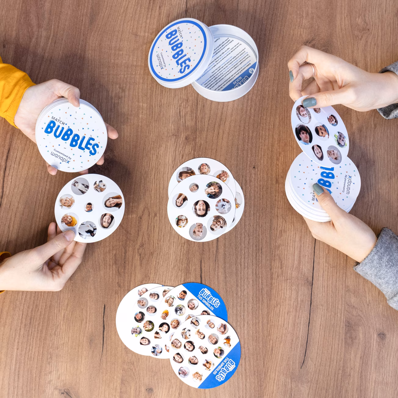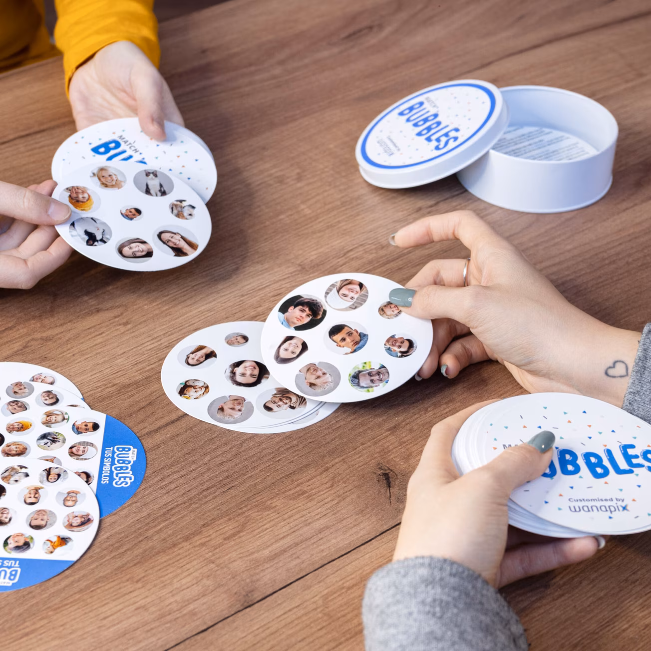 El juego es muy divertido, sencillo y familiar, para todas las edades. Solo por eso es un regalo perfecto para cualquier persona de cualquier edad. Pero además, este juego Match Bubbles es personalizado. Eso significa que tú vas a poder cargar desde tu móvil u ordenador los símbolos que quieres que aparezcan en las cartas. Como en el juego básico, siempre habrá solo un símbolo que coincide entre dos cartas cualesquiera. Pero el hecho de que esos símbolos puedan ser la cara de cada miembro de la familia, o del perro o gato de la familia, o poner amigos, dibujos o cualquier logo o símbolo que os guste, hace que el juego sea el doble de original.