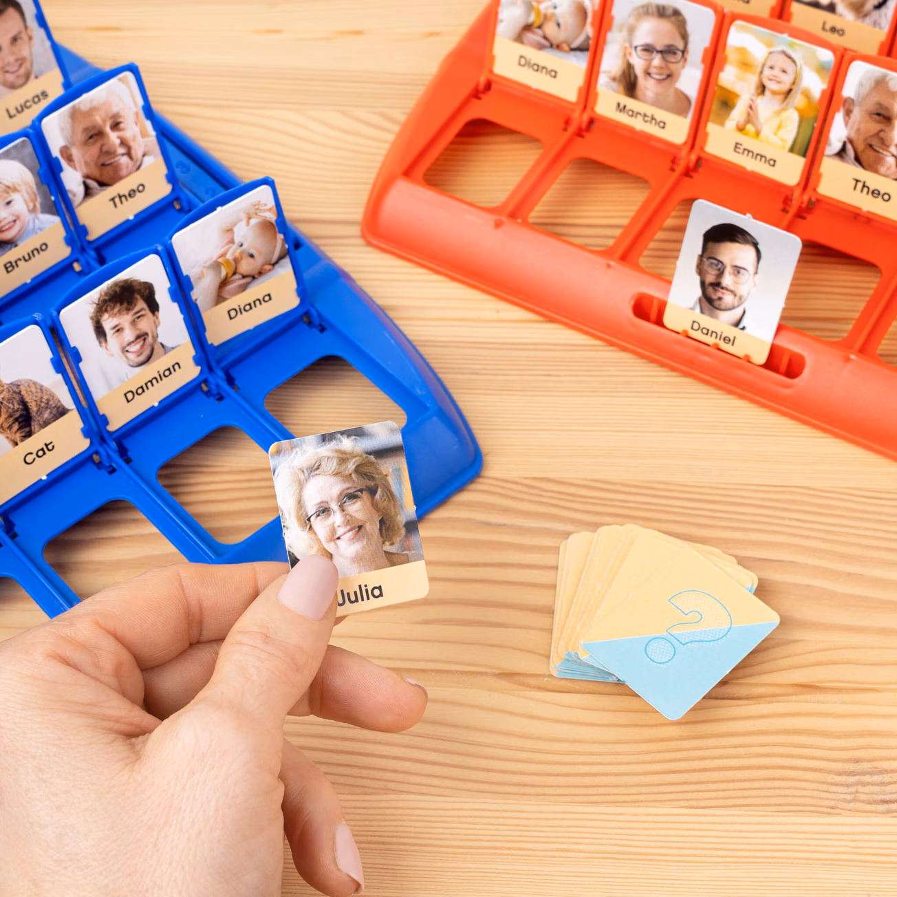Este producto consiste en dos tableros de plástico resistente, uno rojo y otro azul. Cada uno contiene 24 personajes diferentes. Puedes personalizar este producto de manera que puedes subir las 24 fotos que quieras, de 24 personas distintas. Pueden ser tus amigos, familiares, tus hijos, padres, hermanos, compañeros de trabajo… ¡quien quieras!