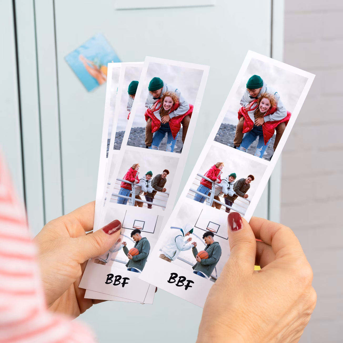 No hay pedido mínimo: puedes personalizar y comprar una sola tira de fotomatón. Aunque si quieres pedir varias tiras iguales, disponemos de descuentos por cantidad, de manera que cuantas más unidades iguales pidas, menos te costará cada unidad.