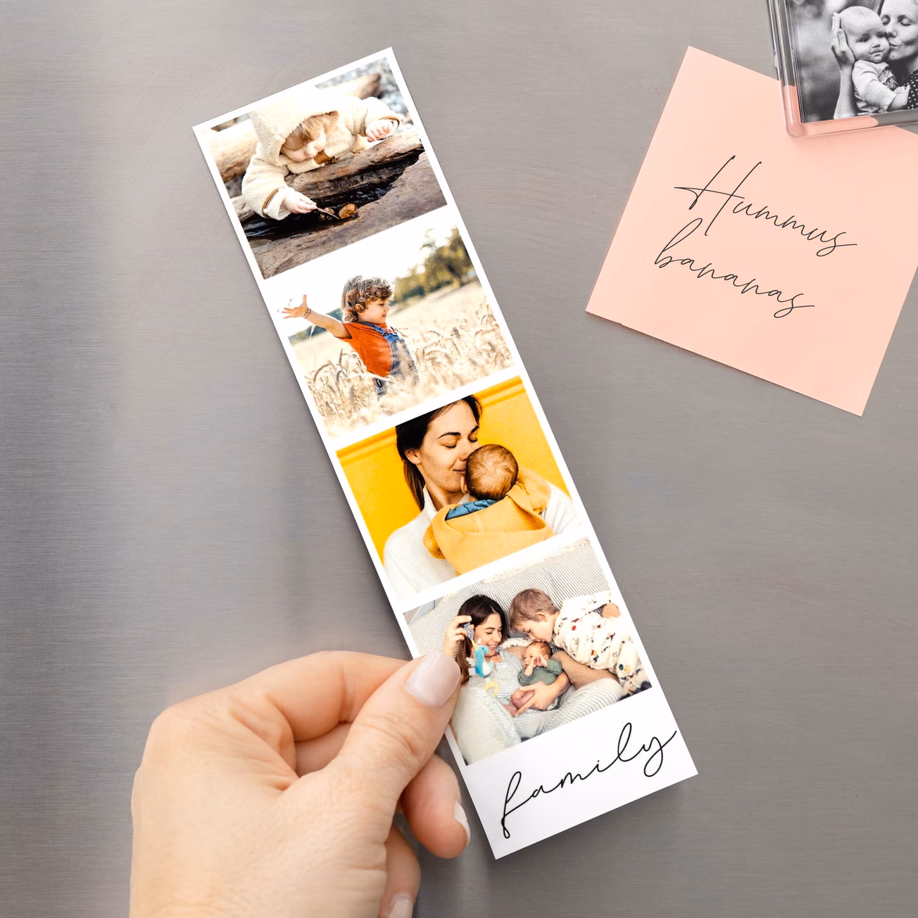 Descubre la nueva tendencia en revelado fotográfico: las tiras de fotomatón personalizadas. Se trata de unas tiras en formato alargado, en las cuales podrás colocar tus fotos favoritas: selfies, fotografías con tus amigas, amigos y familiares, recuerdos de viajes con tu pareja, o cualquier imagen o diseño. En nuestro Editor Online podrás elegir entre algunas plantillas prediseñadas, para poder crear tus tiras de manera más cómoda y rápida, con plantillas para colocar 4 fotos por tira, o 2 fotos y un texto, entre otras opciones. Pero si lo prefieres, puedes crear desde cero la personalización, para poner lo que quieras: fotos, textos, nombres, un diseño, etc.